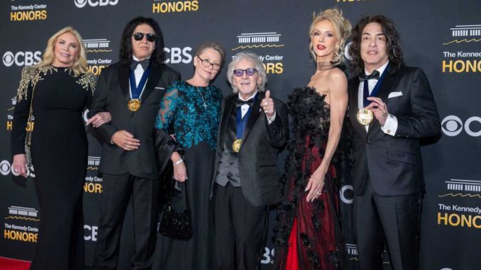 From left, Shannon Tweed Simmons, 2025 Kennedy Center Honoree and member of rock band KISS Gene Simmons, Gigi Criss, 2025 Kennedy Center Honoree and member of rock band KISS Peter Criss, Erin Stanley and 2025 Kennedy Center Honoree and member of rock band KISS Paul Stanley pose on the red carpet for the 48th Kennedy Center Honors at the Kennedy Center for the Performing Arts.